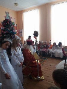 Напередодні, 18 грудня, учні школи, разом з батьками та учителями, зібралися, щоб розказати про доброчинні справи святого Миколая, навчитися любити ближнього, робити добрі й милосердні вчинки. Через велику кількість учнів та гостей у школі проведено два заходи до Дня святого Миколая. Спочатку виступили учні 1 та 4 класів, а пізніше – учні 2 та 3 класів. Діти у віршах, прозі та піснях уславили Чудотворця Миколая. Дуже повчальними були сценки, які поставили учні.  Зворушливо, із хвилюванням, звернулися до Миколая найменші – учні 1 класу. Учні початкових класів виконали такі пісні: ” Ой, хто, хто, Миколая любить”, “Нічка-чарівничка”, “Святий Миколай”, “Сніжними полями”, “Всі маленькі діточки”, “Доброта Миколая”, “Ішов Миколай лужком-бережком”, “Святий-святий Миколай”, “Зимонька-зима”.