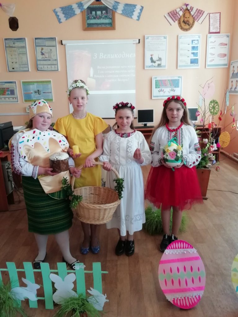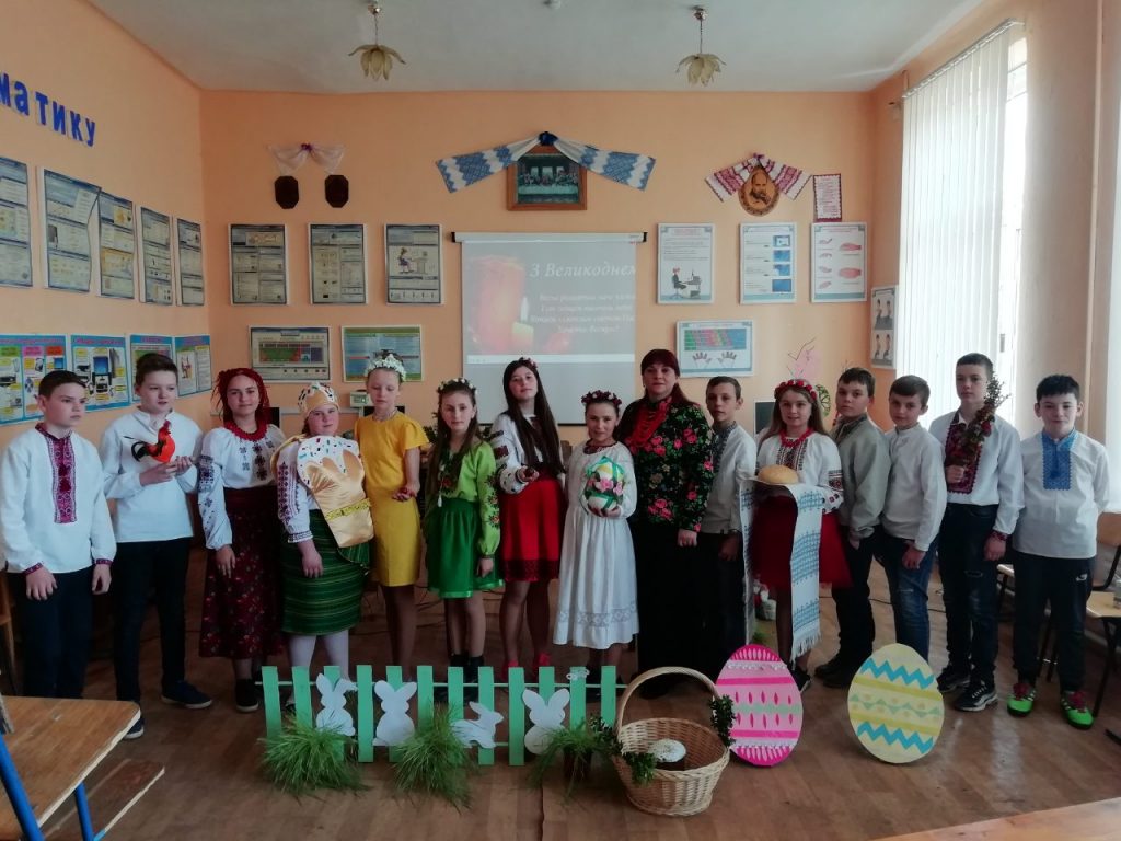 З метою ознайомлення учнів зі звичаями, традиціями і обрядами святкування Великодня, символічним значенням писанки, виховання шанобливого ставлення до власних звичаїв і спонукання учнів до їх відтворення класний керівник 6 класу Підківка О.В., разом із шестикласниками, провела захід “Великдень в Україні”. У віршовій прозі учні передали найголовніше – радість Христового Воскресіння. У заході взяли участь і символічні герої: Весна, Паска, Писанка, Свічка… Учні виконали пісні: “Радійте всі дорослі і діти”, “Гарна писанка у мене”, “Розмалюю писанку”, “Котилася писаночка”.